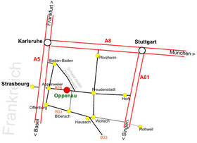 Autobahn A5 Karlsruhe-Basel über die Ausfahrt Appenweier/Straßburg weiter über die B28 in Richtung Oberkirch-Freudenstadt